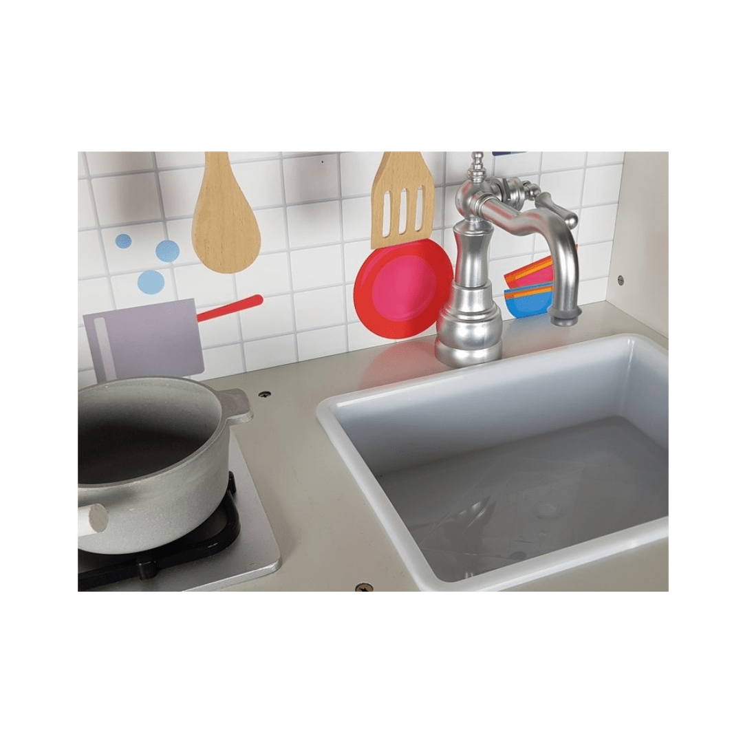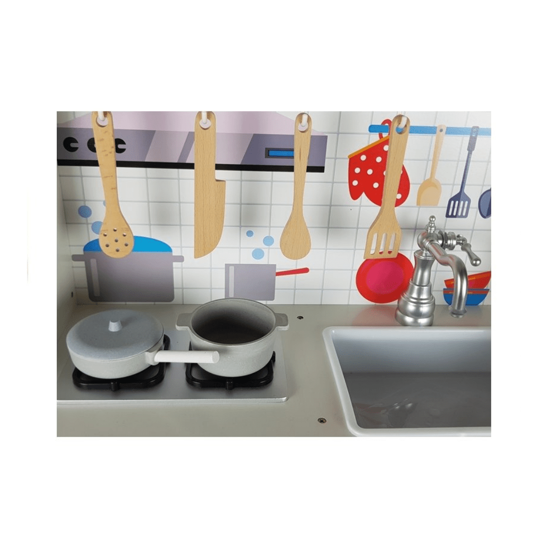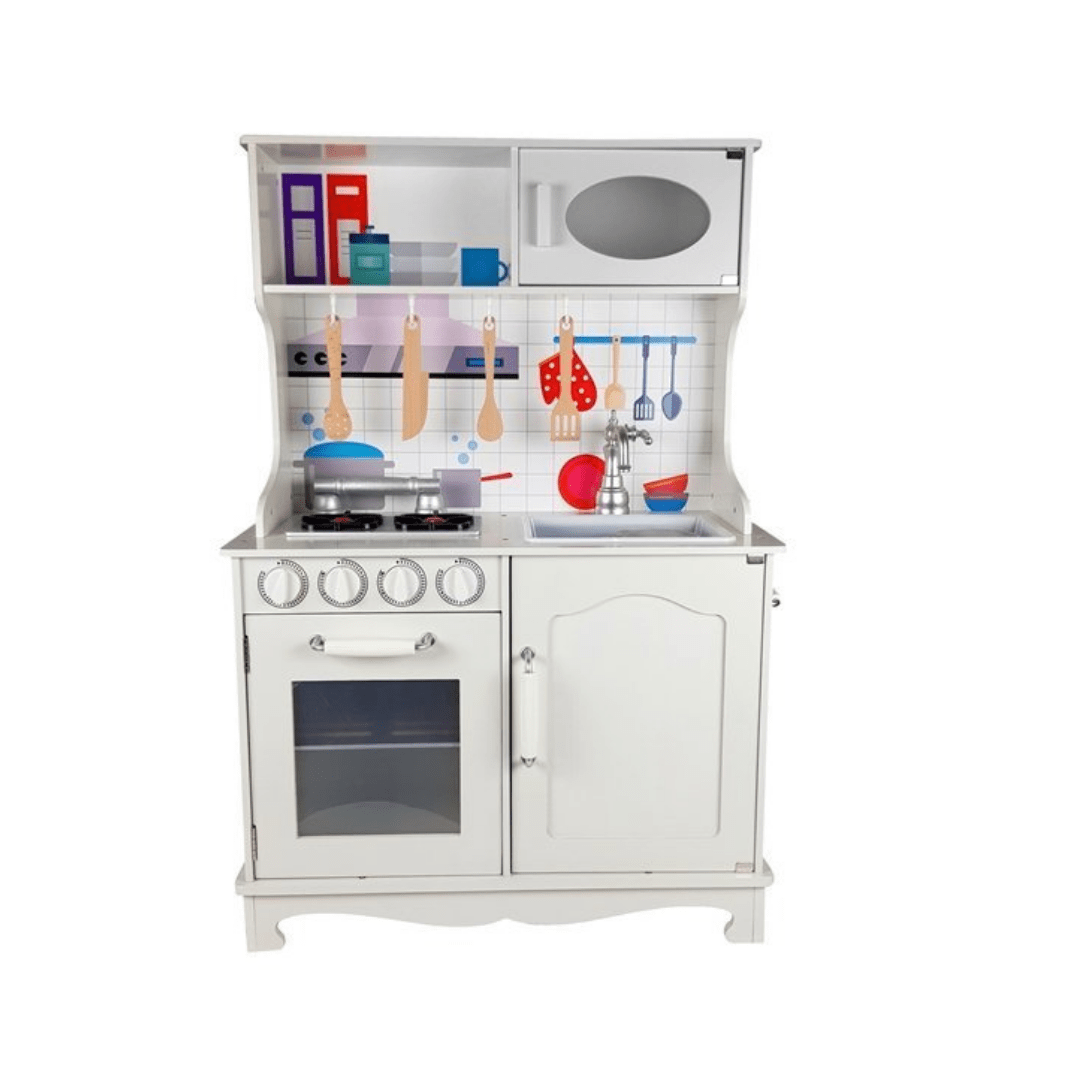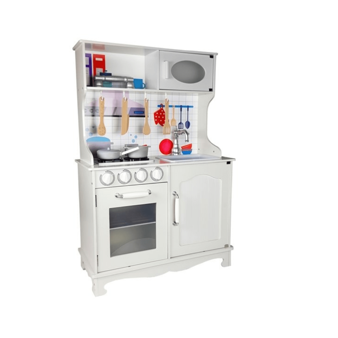 The design of the set refers to the full-size kitchen that a toddler knows from his home. Drawings resembling classic kitchen equipment will only develop the colorful imagination of the child. What’s more – this cooker has an opening microwave , oven and a cupboard with shelves in which the young cook can store his accessories and imitations of food products.